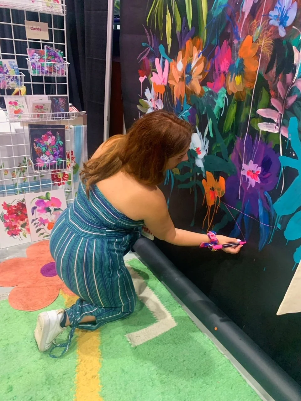 I’ve painted many large scale pieces, mostly on paper rolls. Here is a compilation of many of them for color and scale. All of my murals are vibrant and use the entire color wheel, however if chosen we can make a custom palette if necessary.